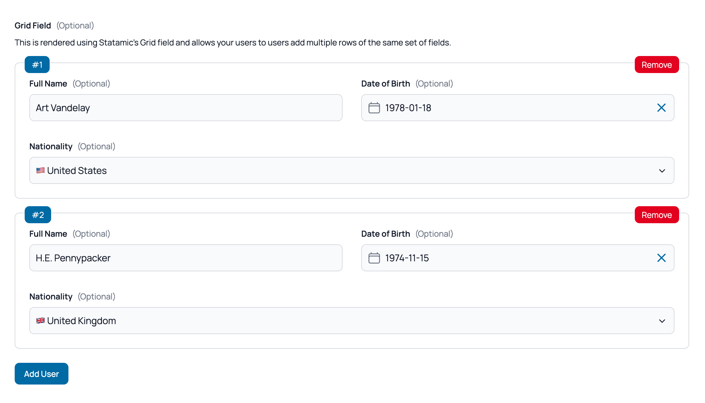The Grid field lets users add multiple rows of the same set of fields. Useful for things like "add another passenger", "add another line item", or any repeater-style input. Each row contains the same sub-fields and users can add or remove rows as needed.